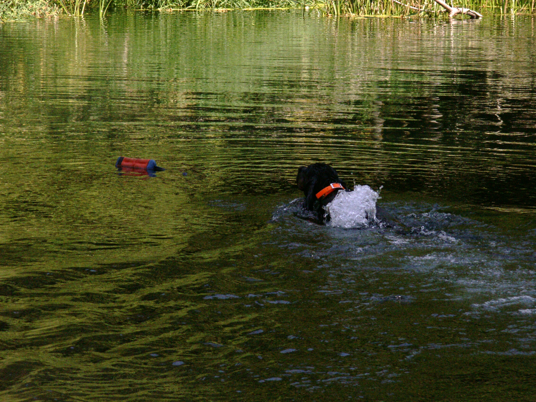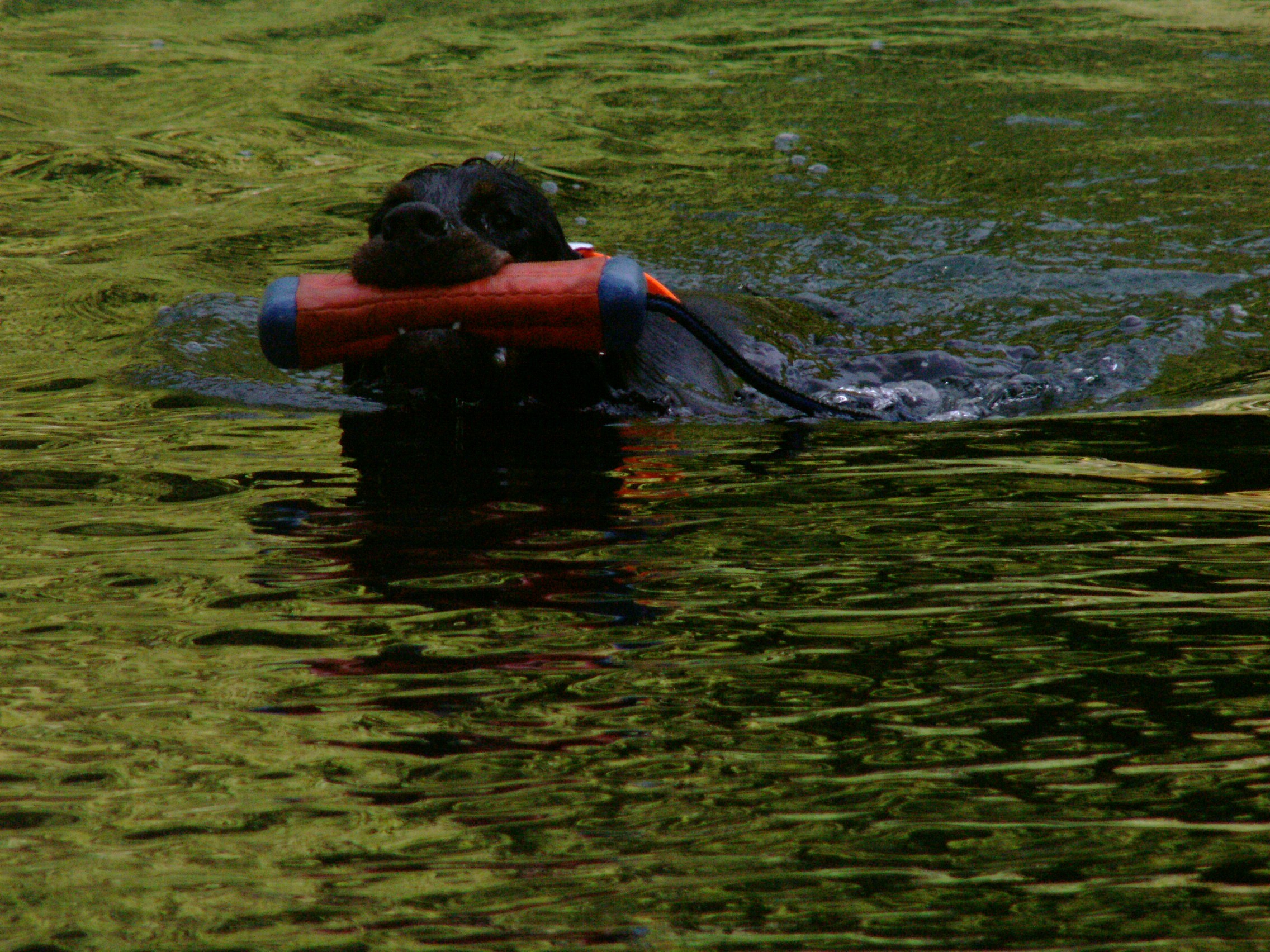 This is completely unlike my last Gordon, Vita, who I could never entice into swimming. So I was utterly surprised at Gael’s instant love of the water and retrieving things in it. Today, at a field practice at Scatter Creek in Olympia, Washington, Gael got to retrieve her bumper several times: